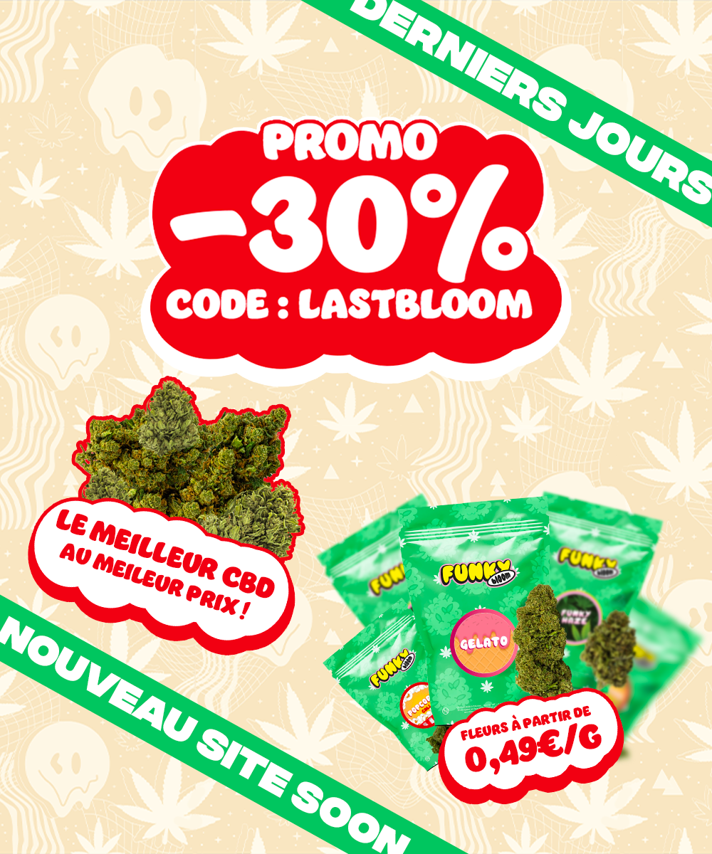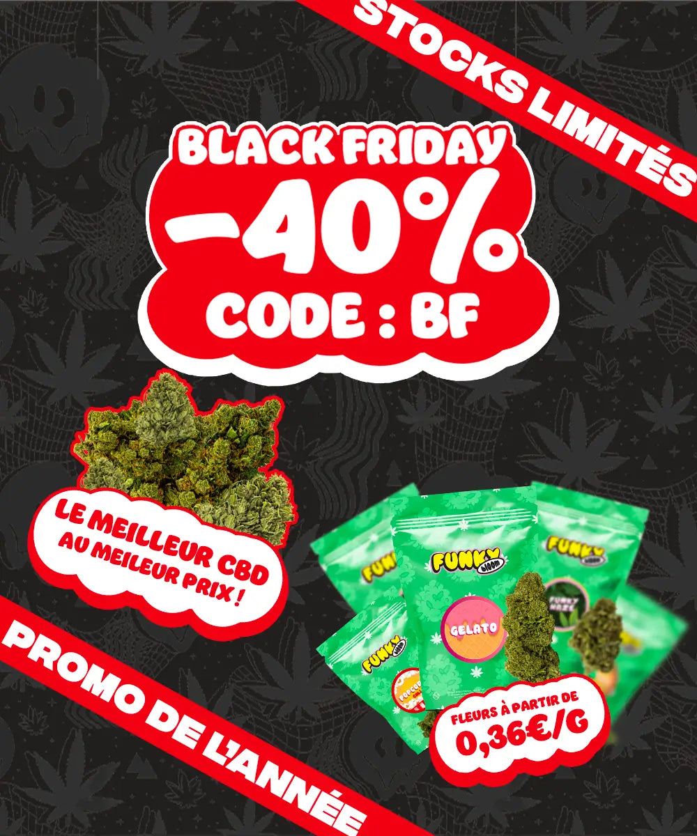 Le CBD, ou cannabidiol, est une des nombreuses substances actives issues du chanvre. Contrairement au THC, il ne provoque pas d'effet psychotrope mais est apprécié pour ses qualités relaxantes. Chez Funky Bloom, nous vous proposons du CBD pur pour une expérience zen sans les effets du THC.